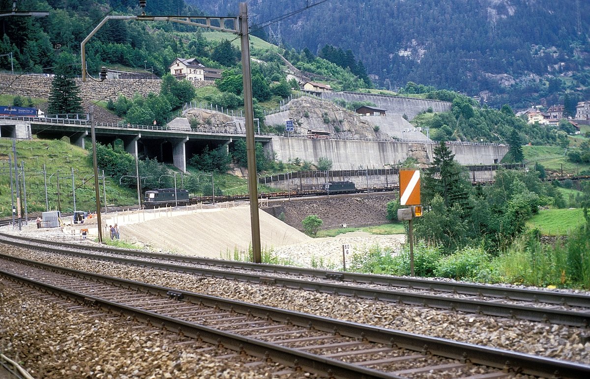 11686 + 11662 Wassen 29.06.88 Güterzug mit Zwischenlok. Man sieht hier den neu gebauten Damm, der im August 1987 durch Hochwasser der Reuss weggerissen wurde.