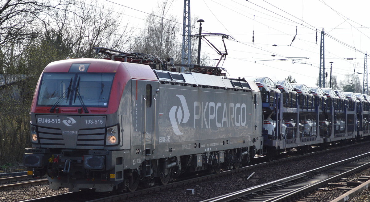 PKP Cargo mit EU46-515/193-515 und PKW-Transportzug Richtung Polen am 09.04.18 Berlin-Hirschgarten.