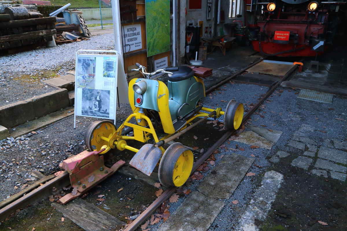 Schienenmoped GKR Typ2, auch als "Schienenschwalbe" bezeichnet, am 23.10.2016 vor dem Museumslokschuppen des "Freundeskreises Selketalbahn" in Hasselfelde, aufgenommen im Rahmen einer Sonderzugveranstaltung der IG HSB. Die Bezeichnung als "Schwalbe" ist eigentlich nicht ganz korrekt, denn dieser Gleiskraftroller wurde auf Basis des Vorgängers der KR51 "Schwalbe", einem KR50 "Spatz", welche allerdings beide im Fahrzeugwerk "Simson" Suhl hergestellt wurden, gefertigt. (Bild 2)