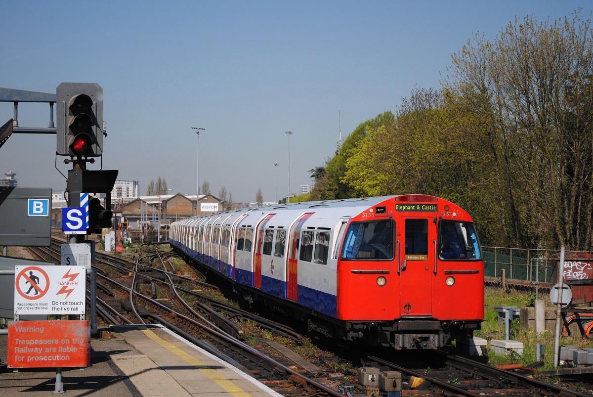 Ein vom Tw.102 geführter Zug der Picadilly Line passiert den Stellwerksturm der Haltestelle Rayners Lane. (18.04.2018)
