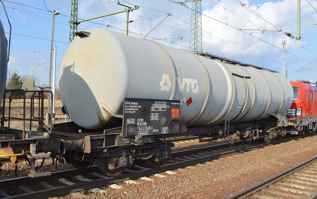 Kesselwagen vom Einsteller VTG in Deutschland mit der Nr. 33 RIV 80 D-VTGD 784 0 545-7 Zacns Bf. Maschen Rbf (UN-Nr.: 33/1208 = Hexane) am 08.03.18 Bf. Flughafen Berlin-Schönefeld.