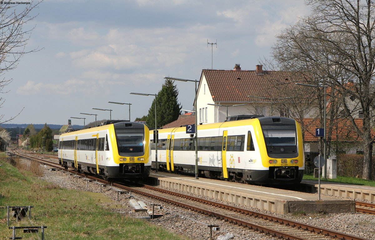 612 053-8 als RE 26390 (Neustadt(Schwarzw)-Villingen(Schwarzw)) und 612 106-4 als RE 26391 (Villingen(Schwarzw)-Neustadt(Schwarzw)) in Löffingen 21.4.18