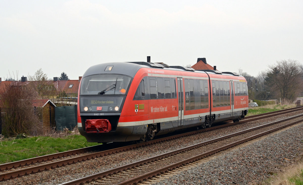 Vom Köthener Bahnhof kommend passiert 642 191 auf dem Rückweg nach Güsten am 11.04.18 das südliche Köthen.