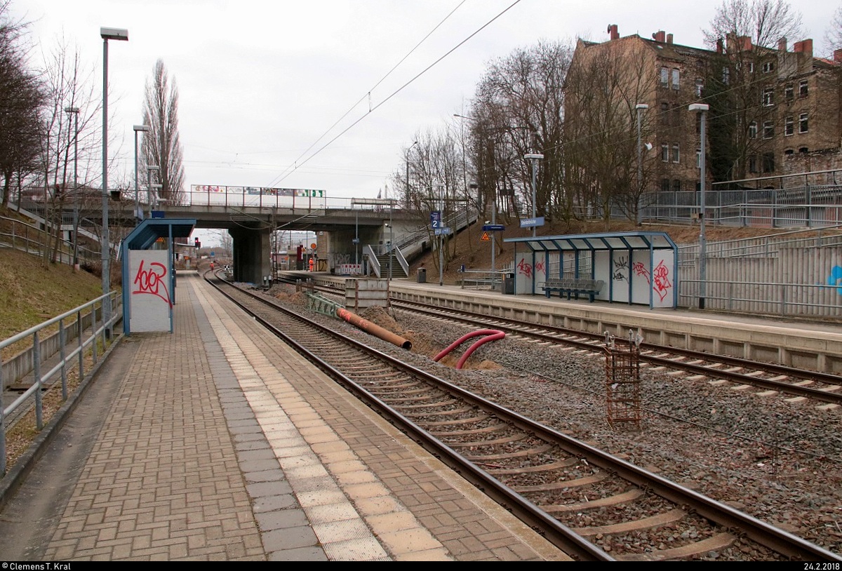 Bauarbeiten am Hp Halle Steintorbrücke auf der Bahnstrecke Halle–Vienenburg (KBS 330). Blick auf die Ausfahrt des Haltepunkts in südlicher Richtung mit DB Museum Halle (Saale) nebenan. [24.2.2018 | 9:46 Uhr]