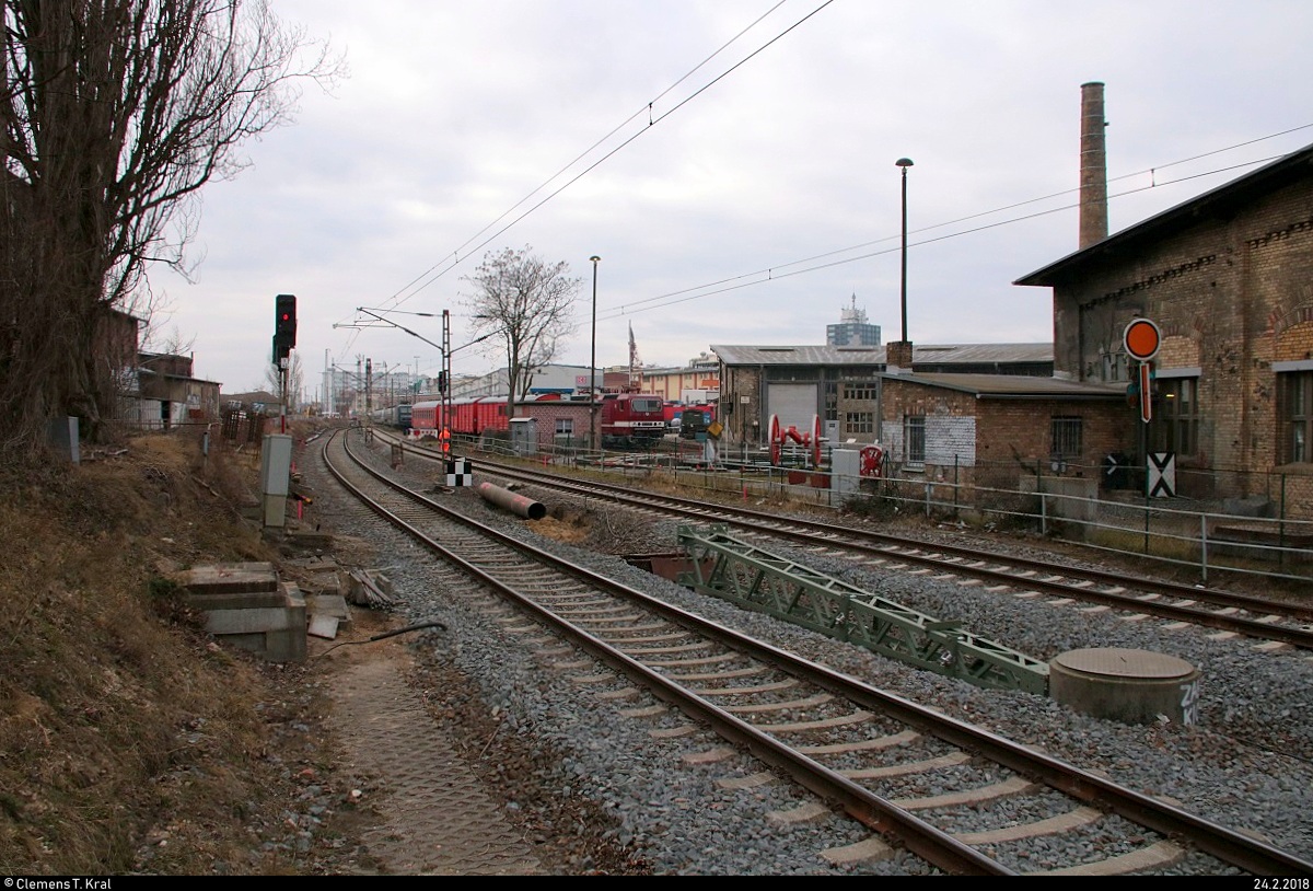 Blick auf die Ausfahrt des Haltepunkts in südlicher Richtung mit DB Museum Halle (Saale) nebenan. [24.2.2018 | 9:46 Uhr]