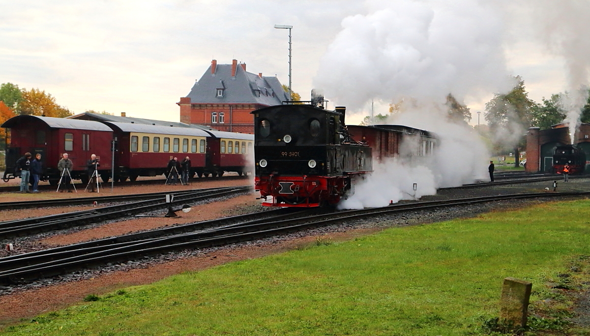 Bahnhof Gernrode am Morgen des 23.10.2016. Nachdem der IG HSB-Sonderzug im Abstellgleis an 99 5901 angekupplt wurde, zieht sie ihn zur Bereitstellung nun zügig aus demselben.