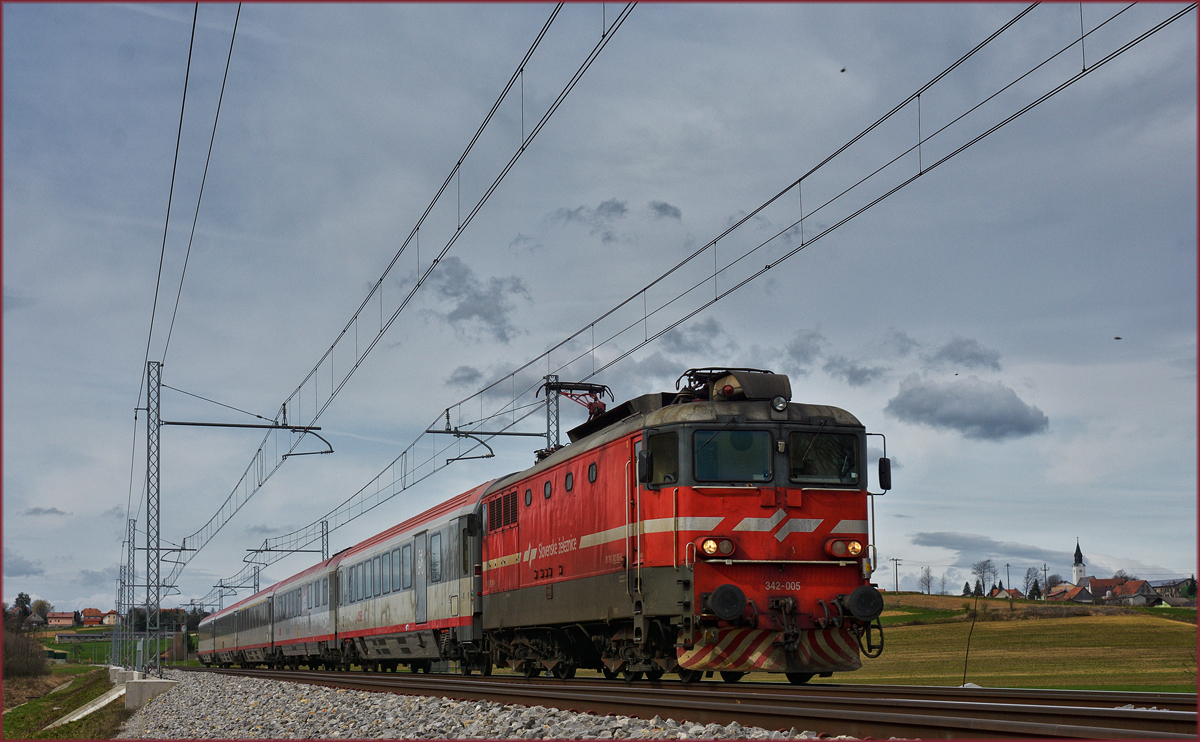 SŽ 342-005 zieht EC158 an Črešnjevec vorbei Richtung Wien. /4.4.2018