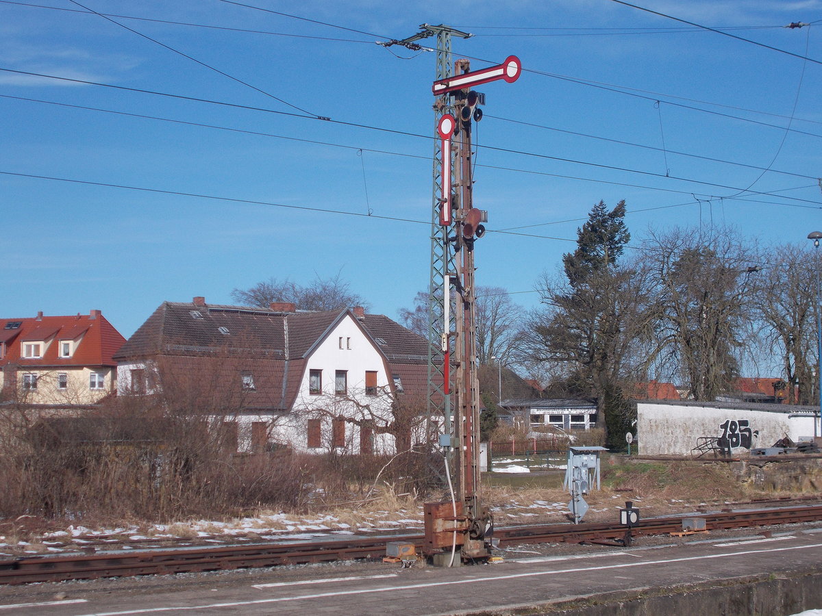 Zweiflügiges Ausfahrsignal "F" in Grimmen Richtung Stralsund am 04.April 2018.