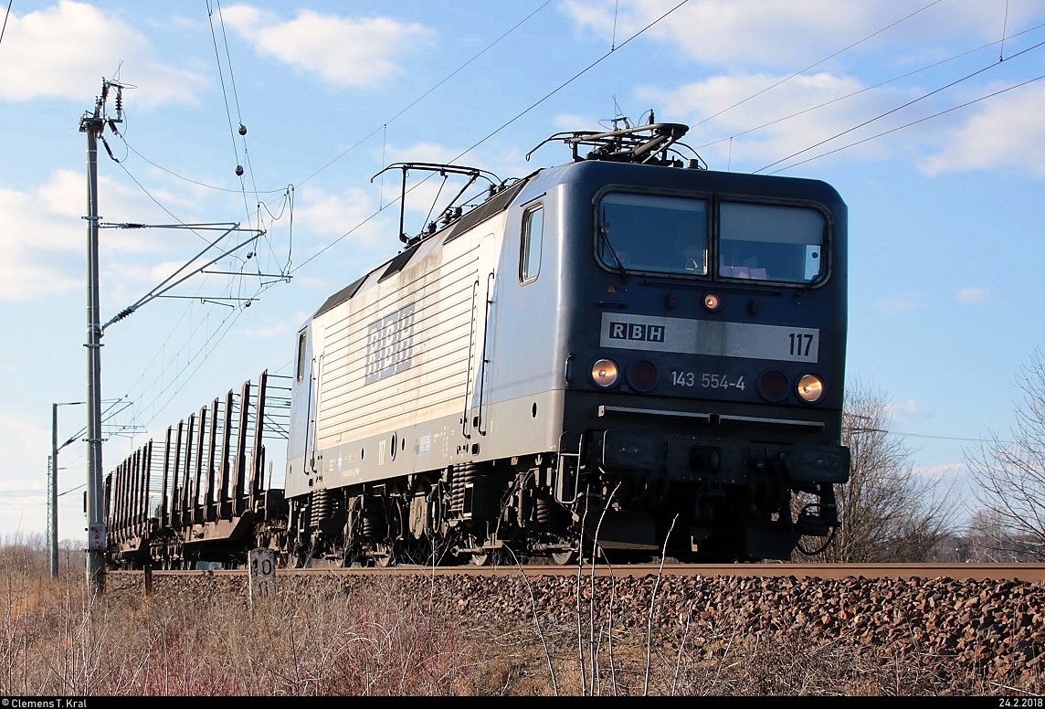 Nachschuss auf einen leeren Flachwagenzug mit Zuglok 143 554-4 (Lok 117) der RBH Rail Logistics GmbH, der am Roßgraben in Angersdorf auf der Bahnstrecke Halle–Hann. Münden (KBS 590) Richtung Halle (Saale). Bild wurde neu zugeschnitten. [24.2.2018 | 15:25 Uhr]