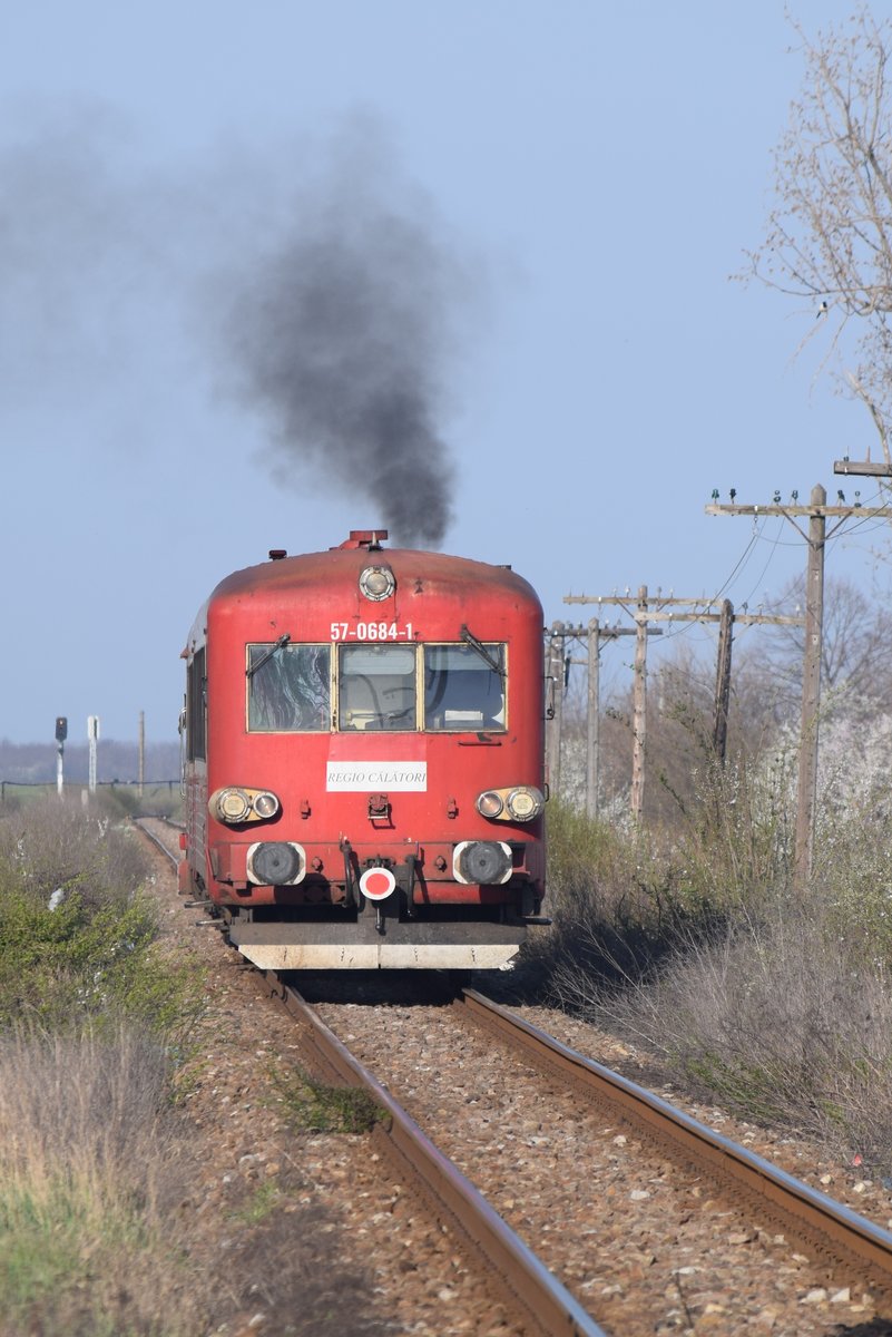 Triebzug 57-0684-1 der Regio Calatori (ehem. Regio Trans) wenige Kilometer nach verlassen des Bahnhofs Urziceni am 09.04.2018