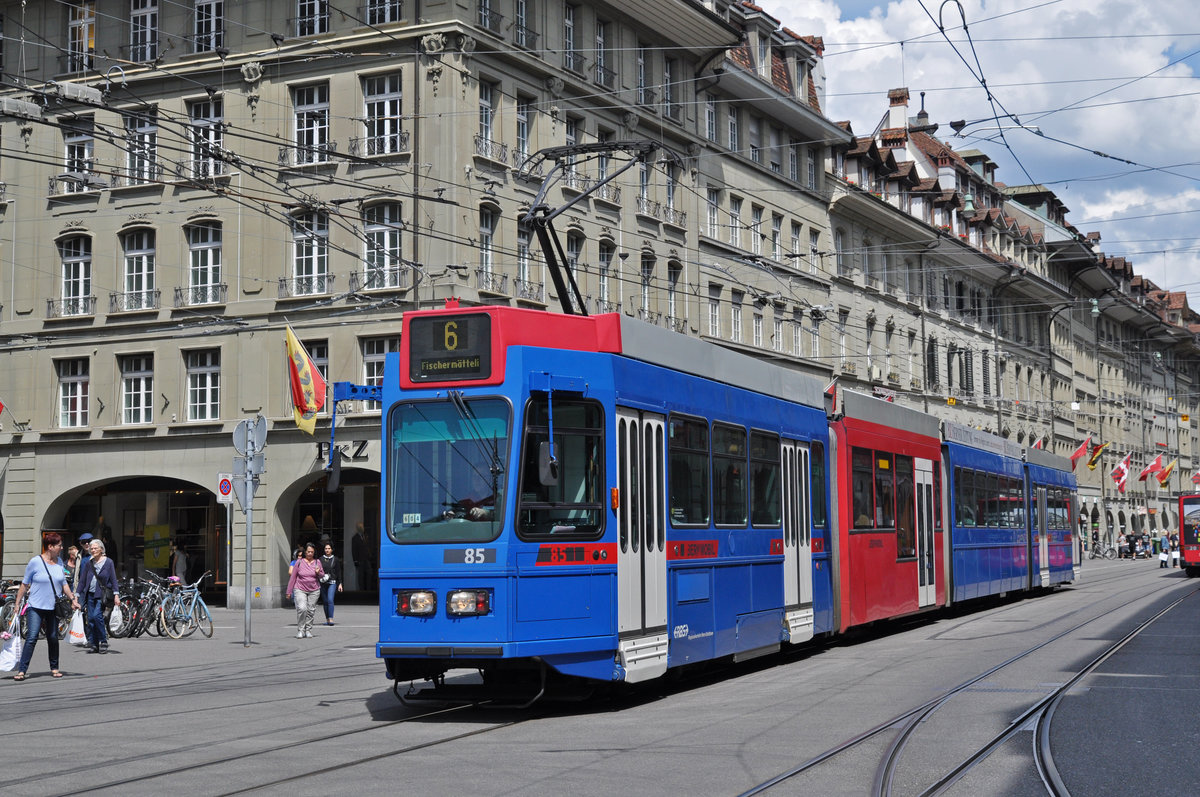 Be 4/10 85 der RBS, auf der Linie 6, fährt zur Haltestelle beim Bahnhof Bern. Die Aufnahme stammt vom 22.05.2018.
