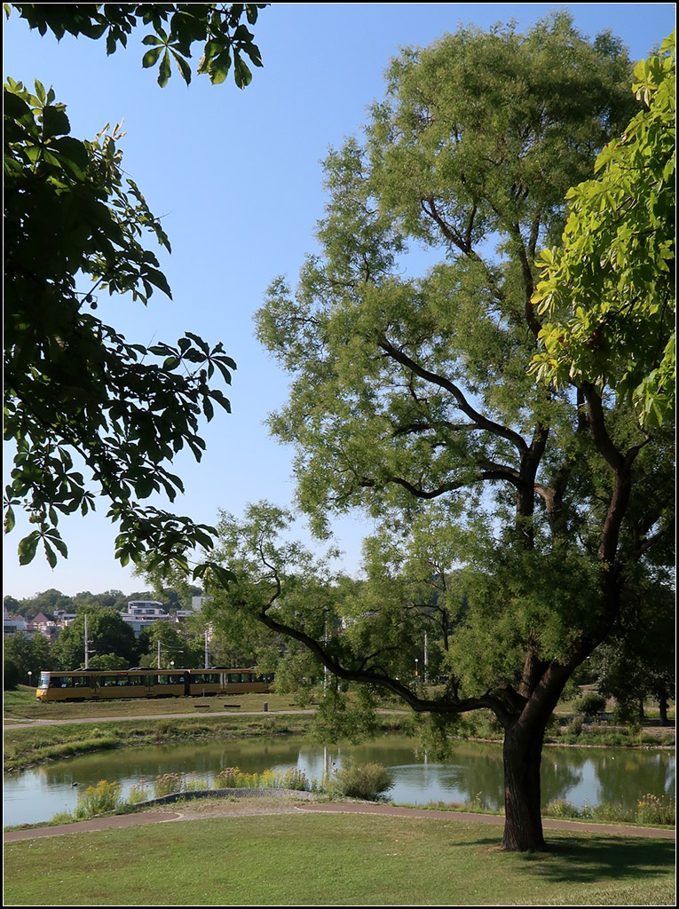 Der Baum (und die Bahn) Ein Zug auf der Stuttgarter Linie U14 verlässt die Haltestelle Mineralbäder in Richtung Mühlhausen. Nach den städtischen Bildern gestern, heute drei sehr grüne Aufnahmen mit eher unauffällig integrierter Bahn. 31.07.2018 (M)
