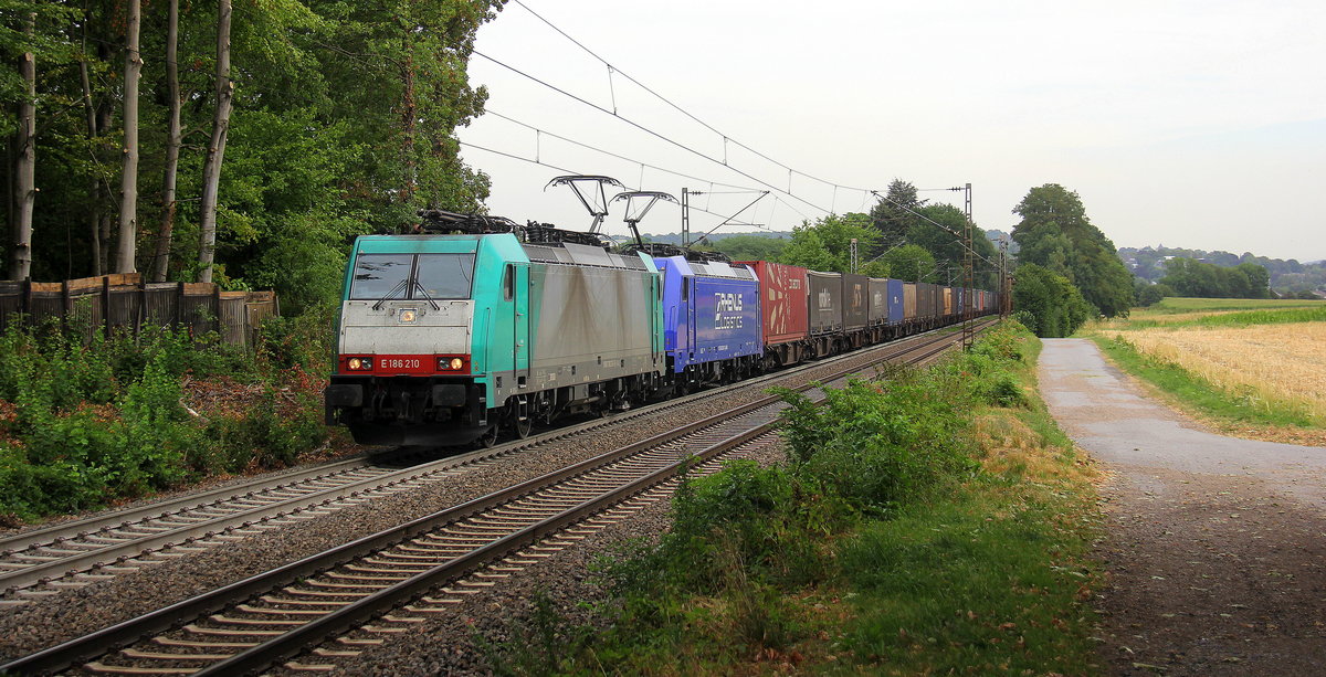 186 210 von Crossrail und 186 269-7 von Rhenus-Logistik kommen die Gemmenicher-Rampe hochgefahren aus Richtung Aachen-West mit einem GTS-Containerzug aus Piacenza(I) nach Zeebrugge-Ramskapelle(B) und fahren in Richtung Gemmenicher-Tunnel,Botzelaer(B),Gemmenich(B),Nouvelaer(B),Moresnet(B),Moresnet-Chapelle(B),Montzen(B). Aufgenommen an der Montzenroute am Gemmenicher-Weg.