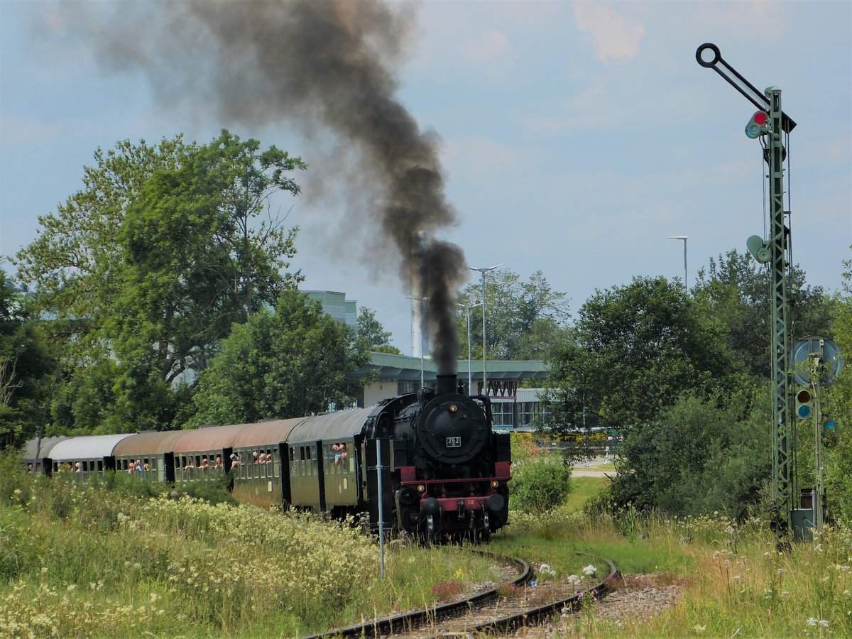 Lok 262 der Sauschwänzlebahn mit einem Museumszug kurz vorm Bahnhof Blumberg-Zollhaus. Aufgenommen im Juli 2018.