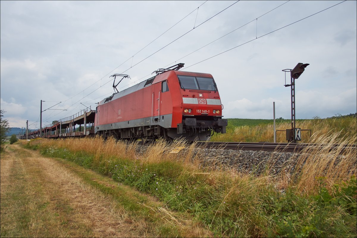 152 149-1 ist bei Dörfle mit einen leeren Autozug am 11.07.2018 unterwegs.