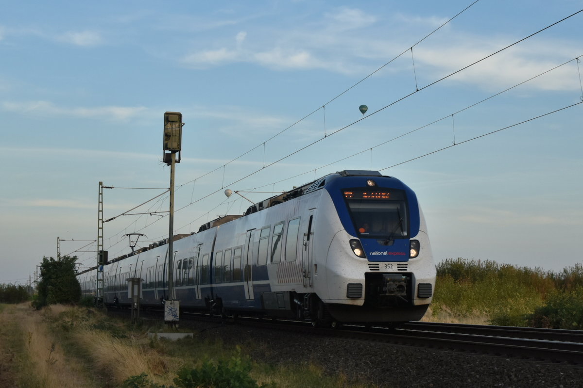 Ein verspäteter Hamster der NX kommt am Samstagabend bei Allerheiligen durch gefahren, wobei im Hintergrund noch zwei Balons in Richtung Dormagen fahren. 18.8.2018