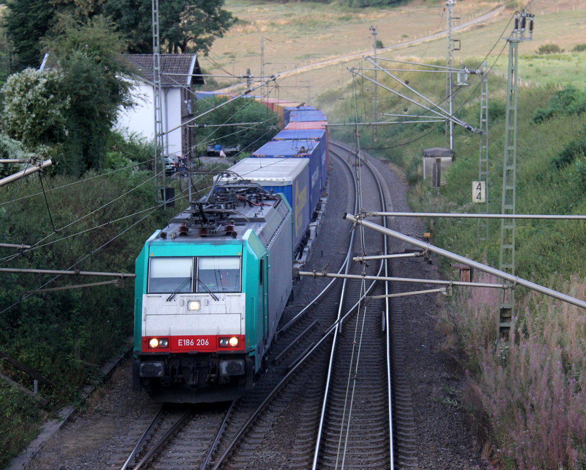 186 206 von Railtraxx kommt die Gemmenicher-Rampe hochgefahren aus Aachen-West mit einem Containerzug aus Püspökladány(H) nach Zeebrugge-Ramskapelle(B) und fährt gleich in den Gemmenicher-Tunnel hinein und fährt in Richtung Montzen/Vise(B).