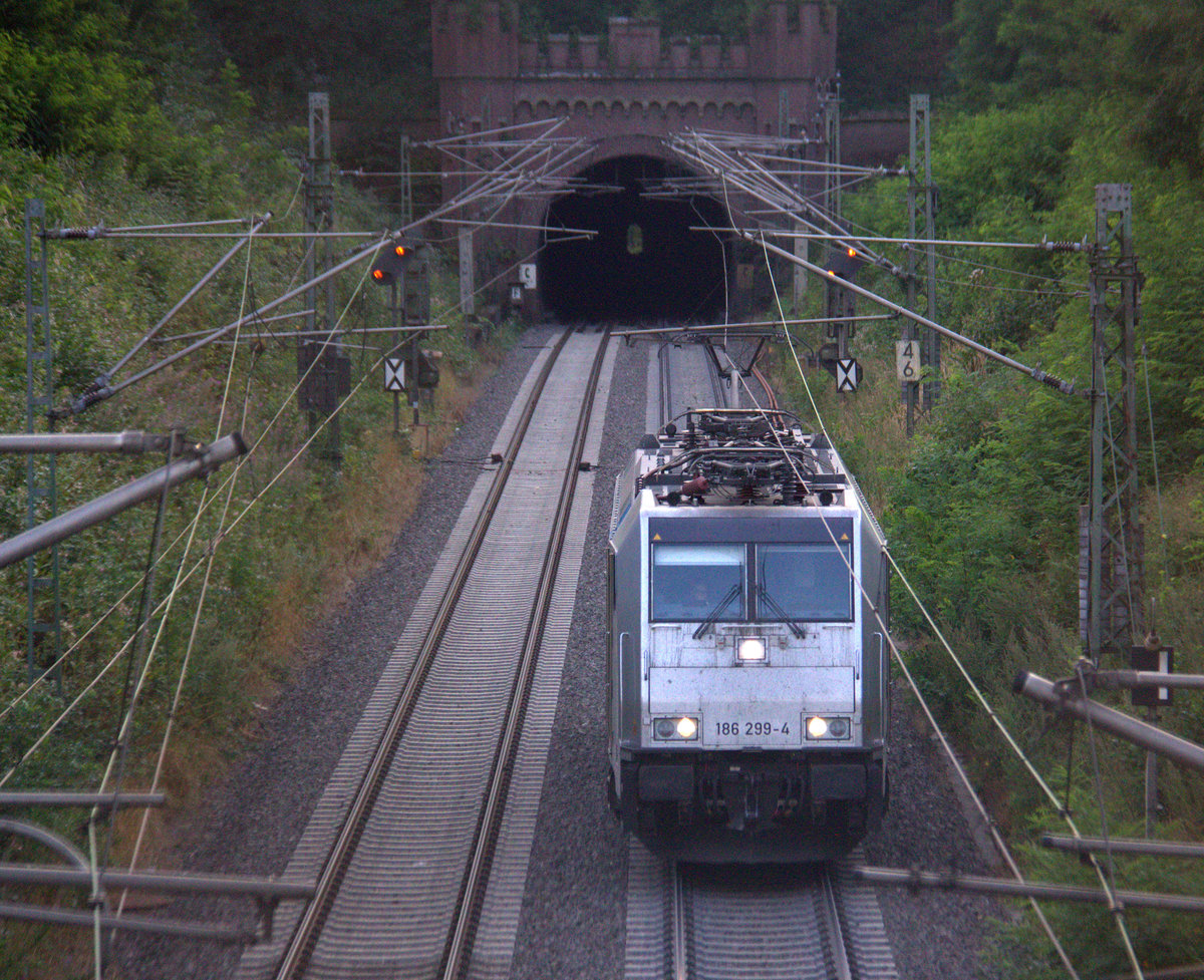 186 299-4 von Lineas/Railpool kommt als Lokzug aus Belgien nach Aachen-West und kam aus dem falschen Gleis aus dem Gemmenicher-Tunnel raus und fährt die Gemmenicher-Rampe herunter nach Aachen-West.