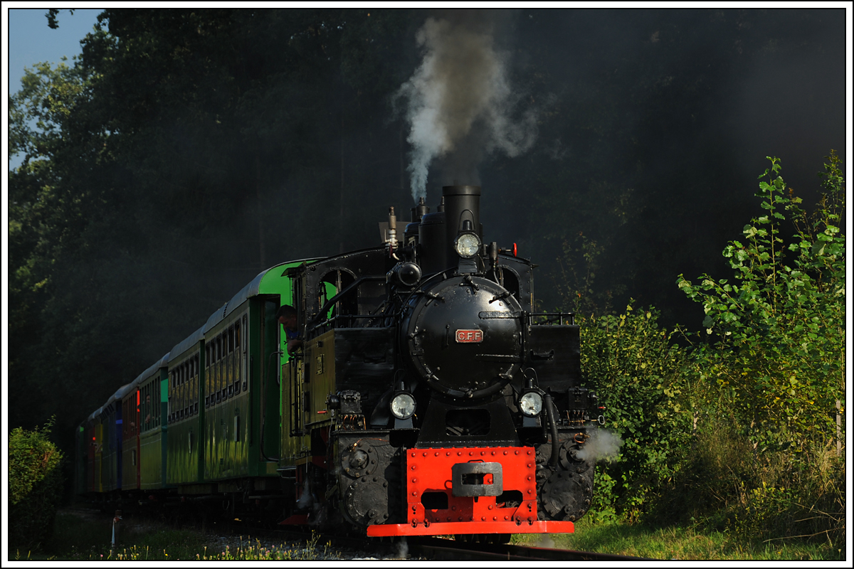 764-411R der Stainzer Bahn am 18.8.18 auf der Fahrt von Preding nach Stainz zwischen den Haltestellen Neudorf/Stainztal und Ölmühle Herbersdorf aufgenommen. Mittlerweile hat Max das große Schild am Tender entfernt und es durch ein kleines unauffälliges ersetzt.