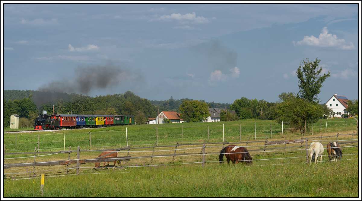 Noch ein Versuch mit den Pferdchen, da sie jetzt anscheinend immer im Freien sind. 764-411R der Stainzer Bahn am 19.8.18 auf der Fahrt von Preding nach Stainz kurz nach der Haltestelle Ölmühle Herbersdorf.