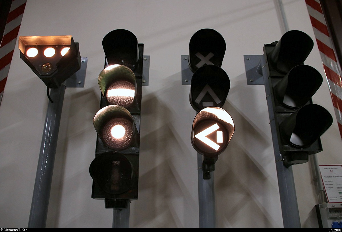 Blick auf Signaltechnik im Historischen Straßenbahndepot Halle (Saale) der Halleschen Straßenbahnfreunde e.V. kurz vor Mitternacht.
