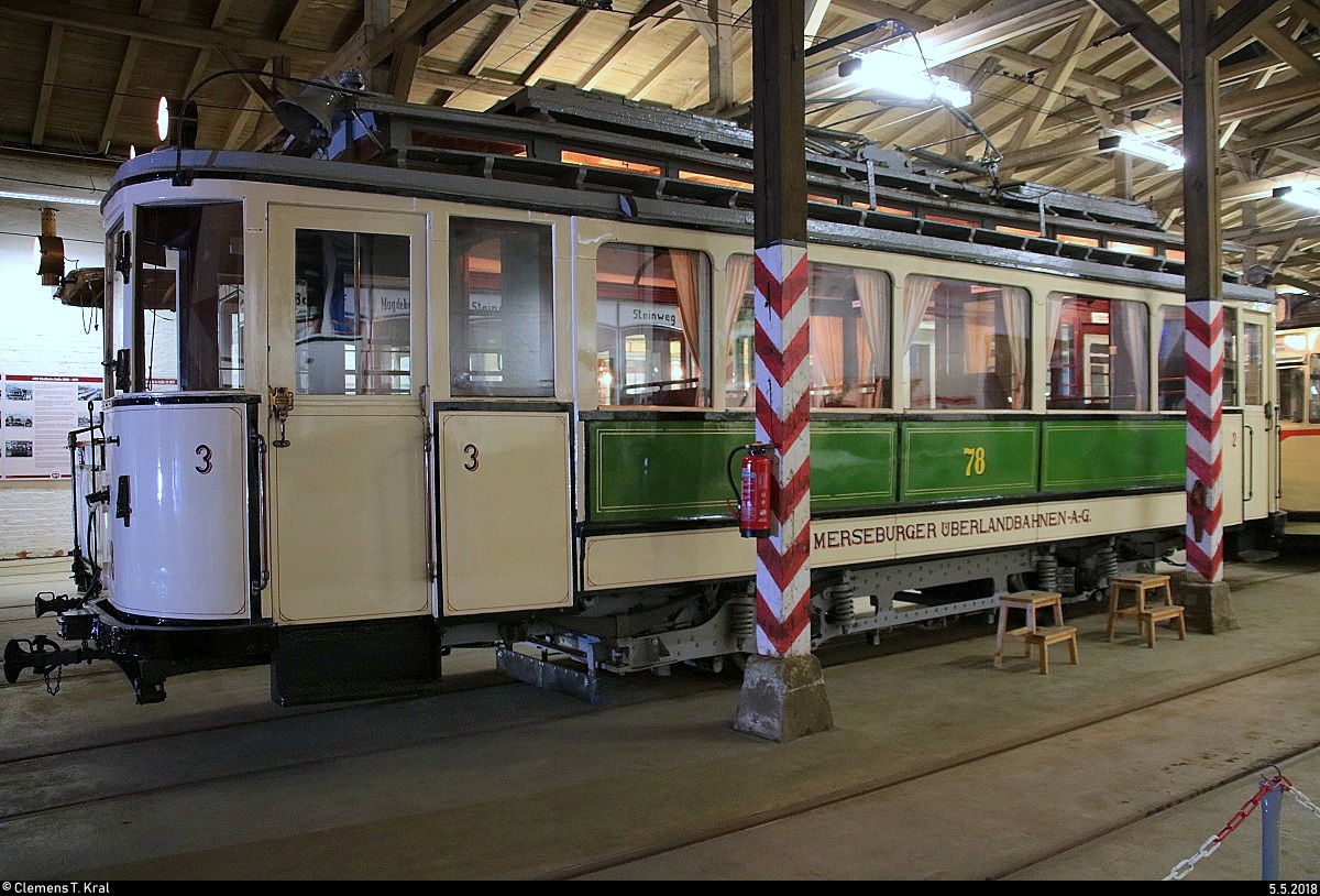 Blick auf Triebwagen 3 (ehem. Merseburger Überlandbahnen AG) der Halleschen Straßenbahnfreunde e.V., der im Historischen Straßenbahndepot Halle (Saale) steht.