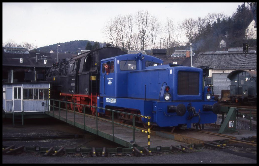 Eisenbahn Museum BW Dieringhausen am 4.3.1995: V 18-02 zieht 950001 auf die Drehscheibe