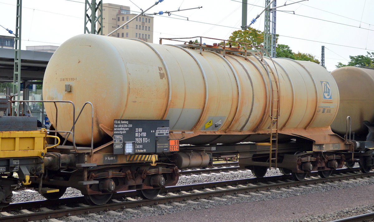 Kesselwagen vom Einsteller VTG Hamburg (altes itg Logo noch sichtbar) mit der Nr. 33 RIV 80 D-VTGD 7929 913-1 Zacns Bf.:Maschen-Rbf. (UN-Nr.:58/2014 = Wasserstoffperoxid, wässrige Lösung mit mindestens 20 %, aber höchstens 60 % Wasserstoffperoxid (Stabilisierung nach Bedarf)) am 20.07.18 Magdeburg Hbf.