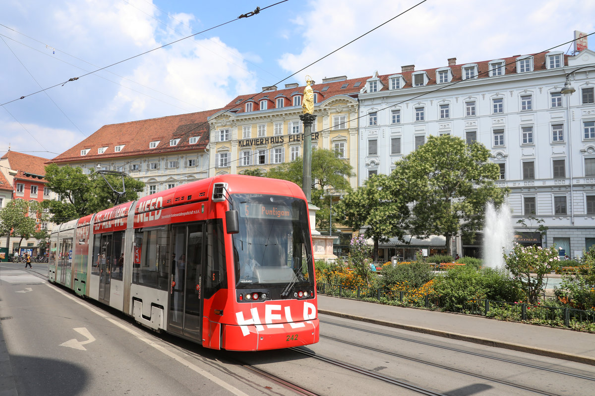 Straßenbahnzug 276 auf der Linie 1 nach Landwasser in der Haltestelle Stadttheater, 29.07.2018.