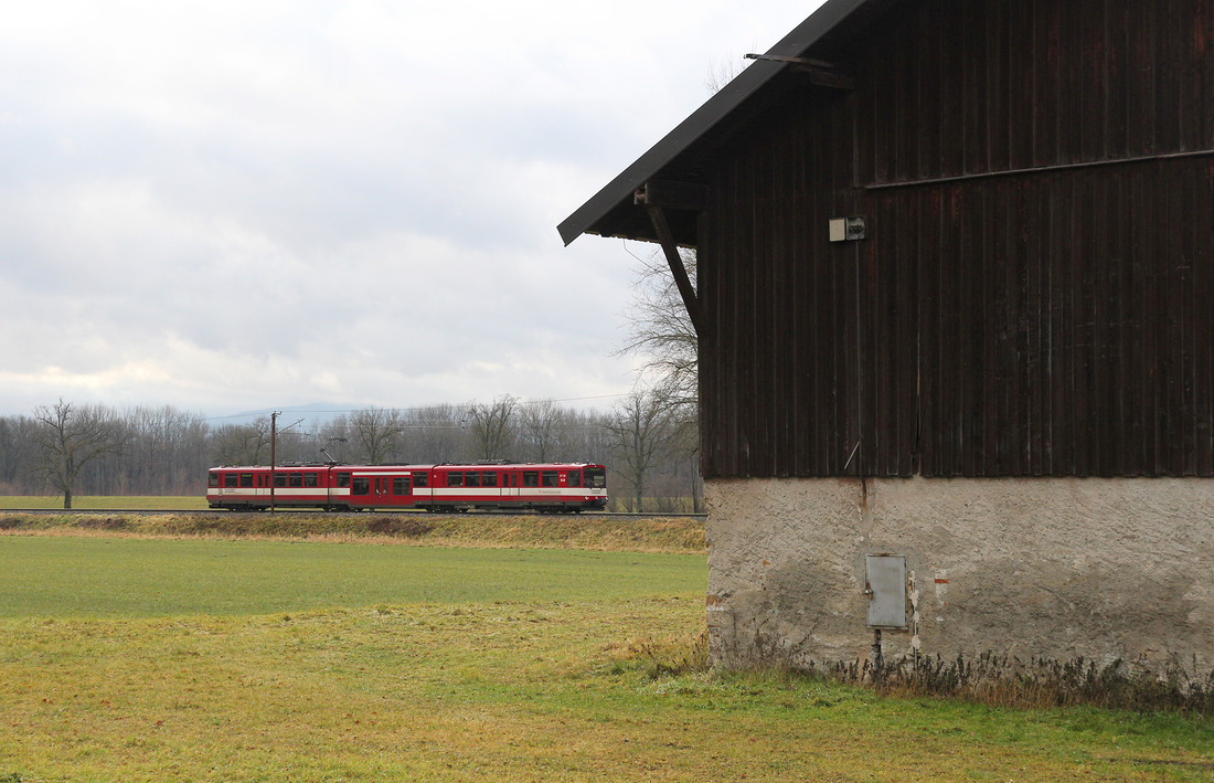 Der Stadler Eea 936 133 schleppt am 13. August 2018 eine SBB RABe 522 zwischen Erlen und Sulgen in Richtung Erlen