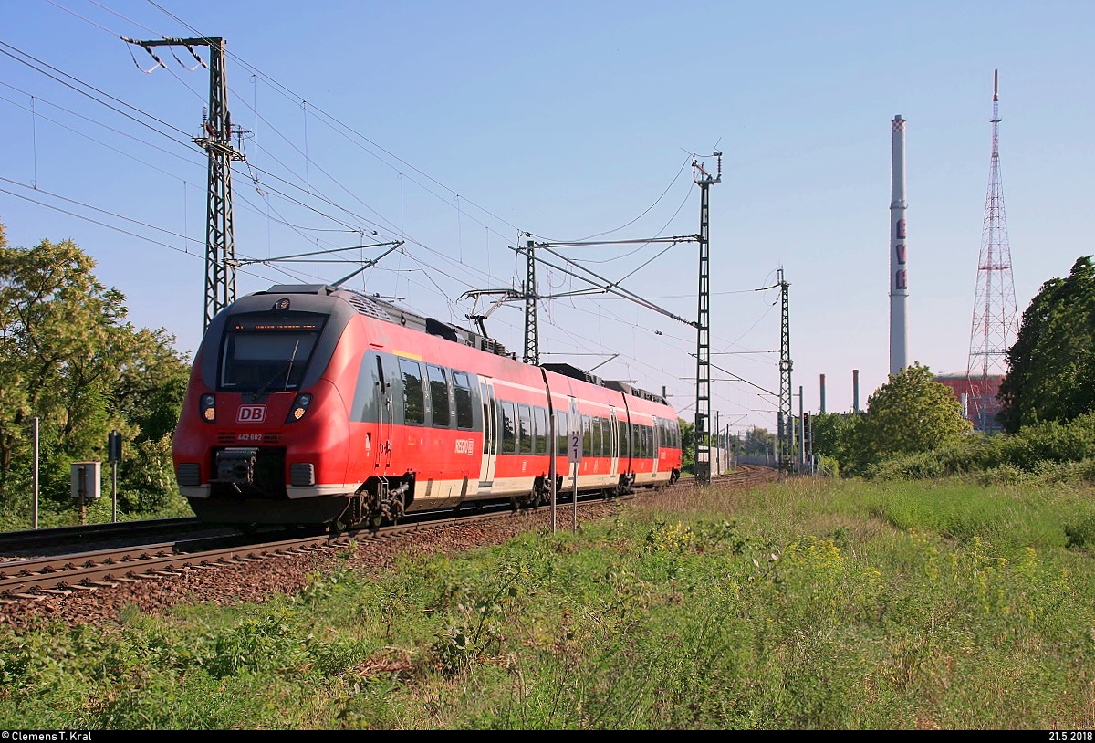 442 602 (Bombardier Talent 2) der S-Bahn Mitteldeutschland (DB Regio Südost) als S 37751 (S7) von Halle-Nietleben nach Halle(Saale)Hbf Gl. 13a überquert gleich die Leipziger Chaussee in Halle (Saale) auf der Ostumfahrung für den Güterverkehr.