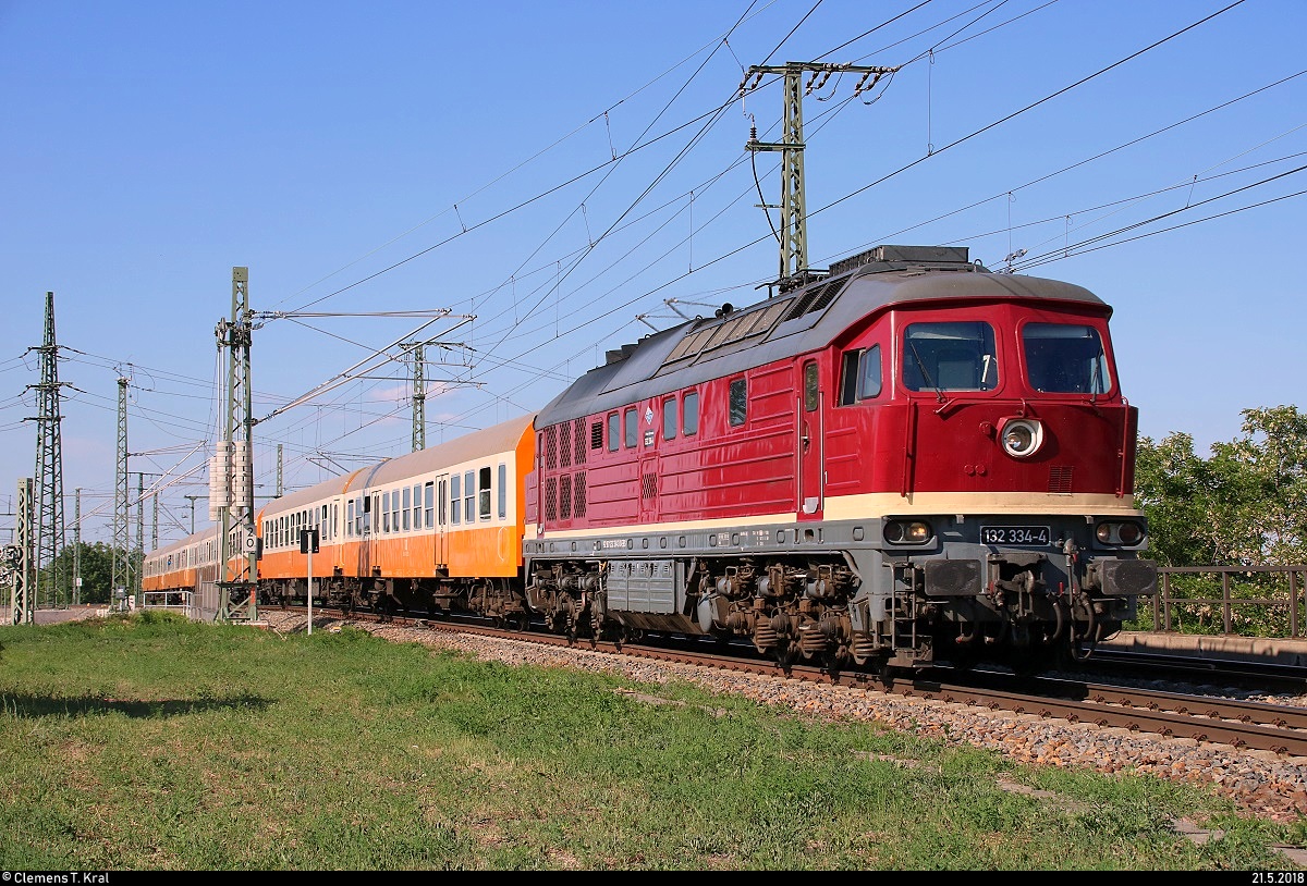 232 334-3 (132 334-4) der Erfurter Bahnservice GmbH (EBS) als DPE 20058 von Ostseebad Binz nach Erfurt Hbf überquert die Leipziger Chaussee in Halle (Saale) auf der Ostumfahrung für den Güterverkehr. Grüße zurück!