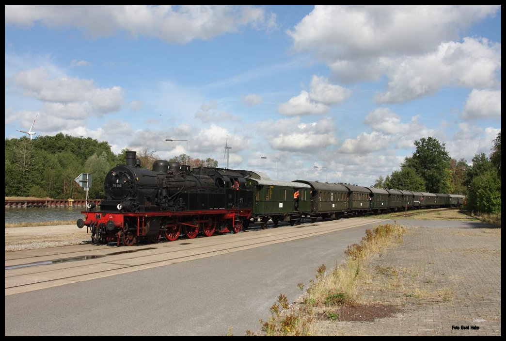 Am 26.08.2018 fand nach vielen Jahren des Stillstandes wieder Personenzug Verkehr auf der Teutoburger Wald Eisenbahn zwischen Ibbenbüren - Aasee und dem Hafen in Dörenthe statt. Das Speicherfest am Hafen war Anlass für einen Pendelzugverkehr, der im Sandwich Verfahren mit VT 03 und der ET Lok 78468 durchgeführt wurde. Hier nähert sich der Zug mit VT 03 an der Spitze der Ortschaft Brochterbeck. Hinter dem Triebwagen ist die Rauchwolke der 78468 zu erkennen, die in der Steigung nach Brochterbeck kräftig schieben musste.