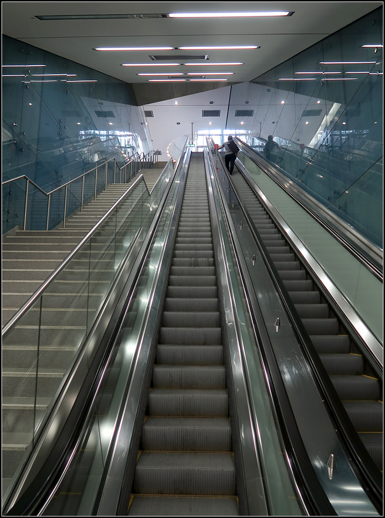 Station Karthäuserhof. Einer der beiden Treppenschächte, die von den Bahnsteigebene aus in den mittleren Bereich der Verteilerebene führen.