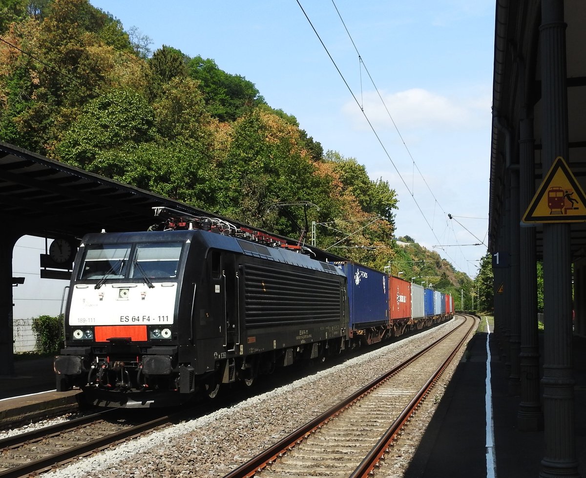 SIEMENS E-LOK ES64 F4-111 MIT CONTAINER-GÜTERZUG IM BAHNHOF ROLANDSECK