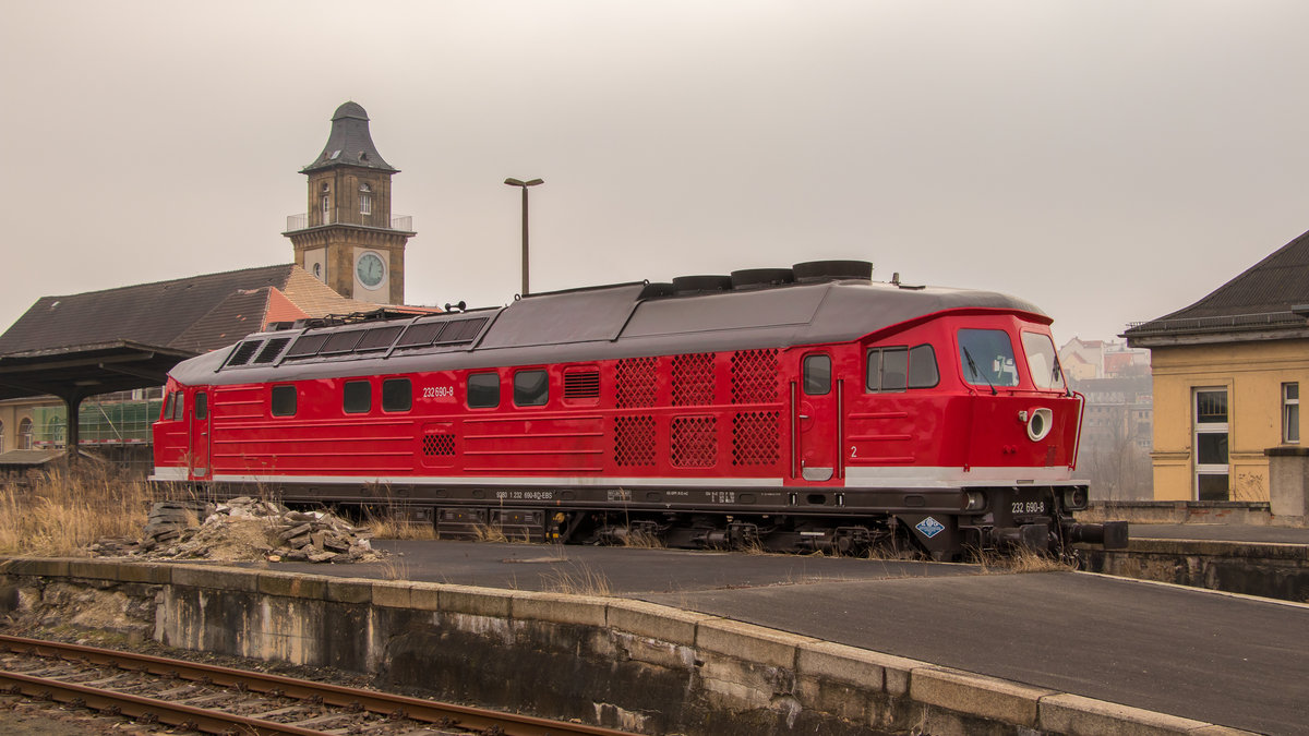 Der Fotograf des Bildes ist fasziniert von diesem Foto! 232 690-8 von EBS mit neuer Lackierung inmitten der Ruinen des Zeitzer Bahnhofes! Das Wetter rundet die Sache ab. Und die Lok strahlt trotzdem. Aufgenommen am 20. Februar 2018.