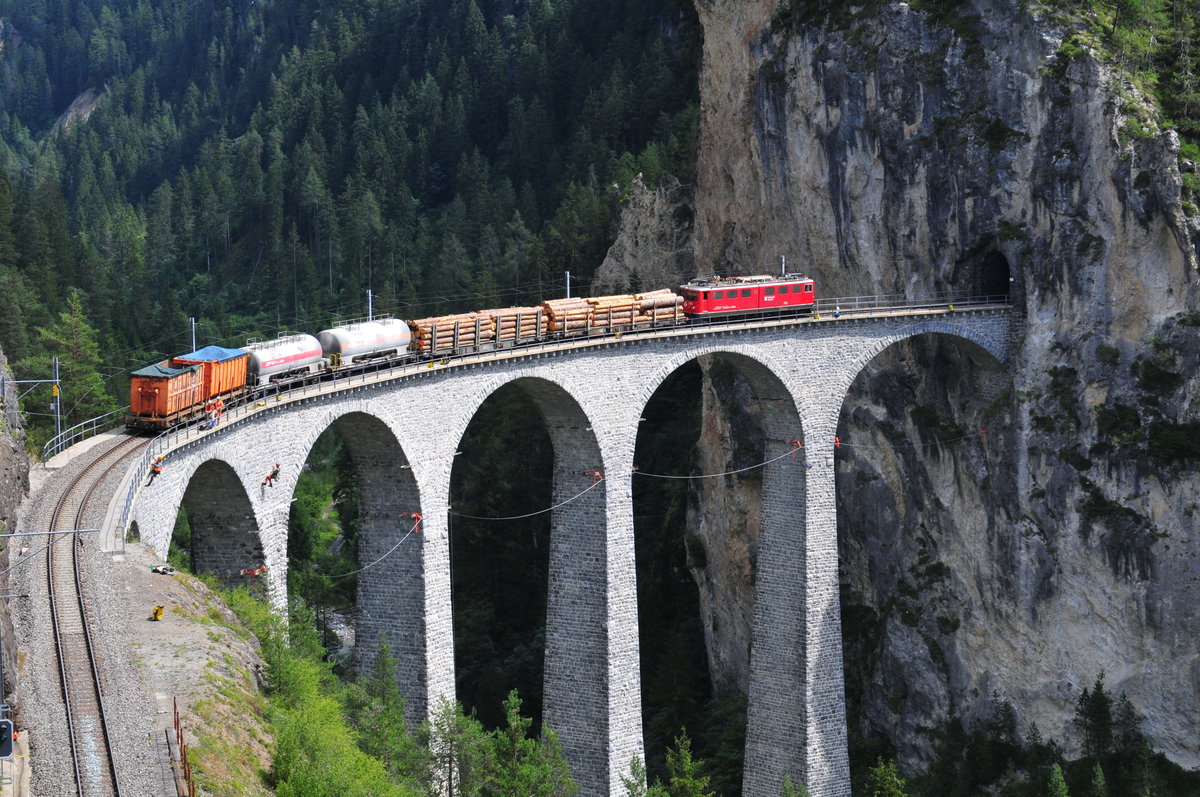 Die Ge 6/6 II 706 mit einem Güterzug am 22.08.2018 auf dem Landwasserviadukt in Richtung Filisur.