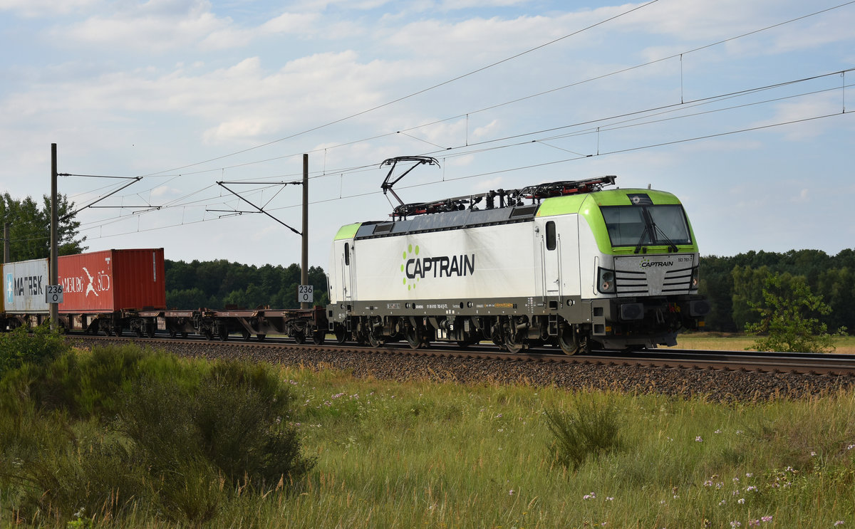 PKP Cargo mit der Vectron 370 016-5/193 504 und einem fast leeren Containerzug, kommend aus Hamburg. 3km östlich von Büchen, 30.07.2018.