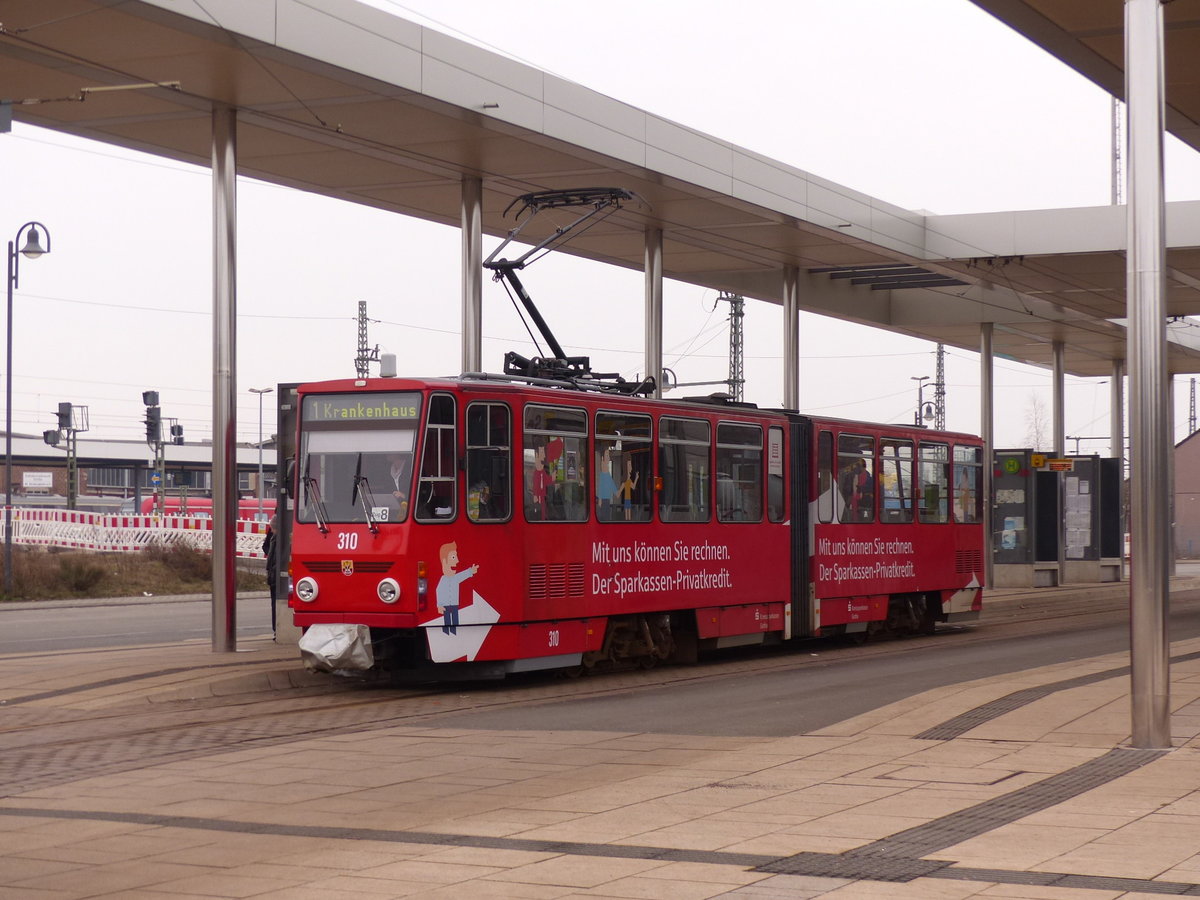 TWSB 310 als Linie 1 zum Krankenhaus, am 17.02.2018 am Hauptbahnhof in Gotha.