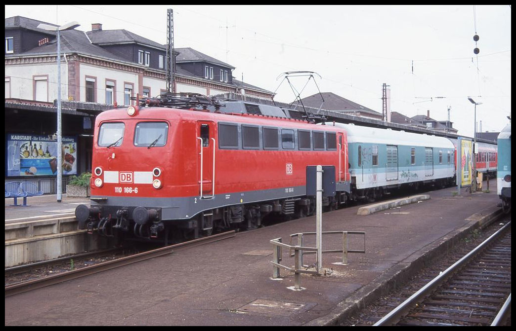 DB 110166-6 steht mit einem Regionalzug am 14.8.1999 um 15.23 Uhr am Bahnsteig in Offenburg.