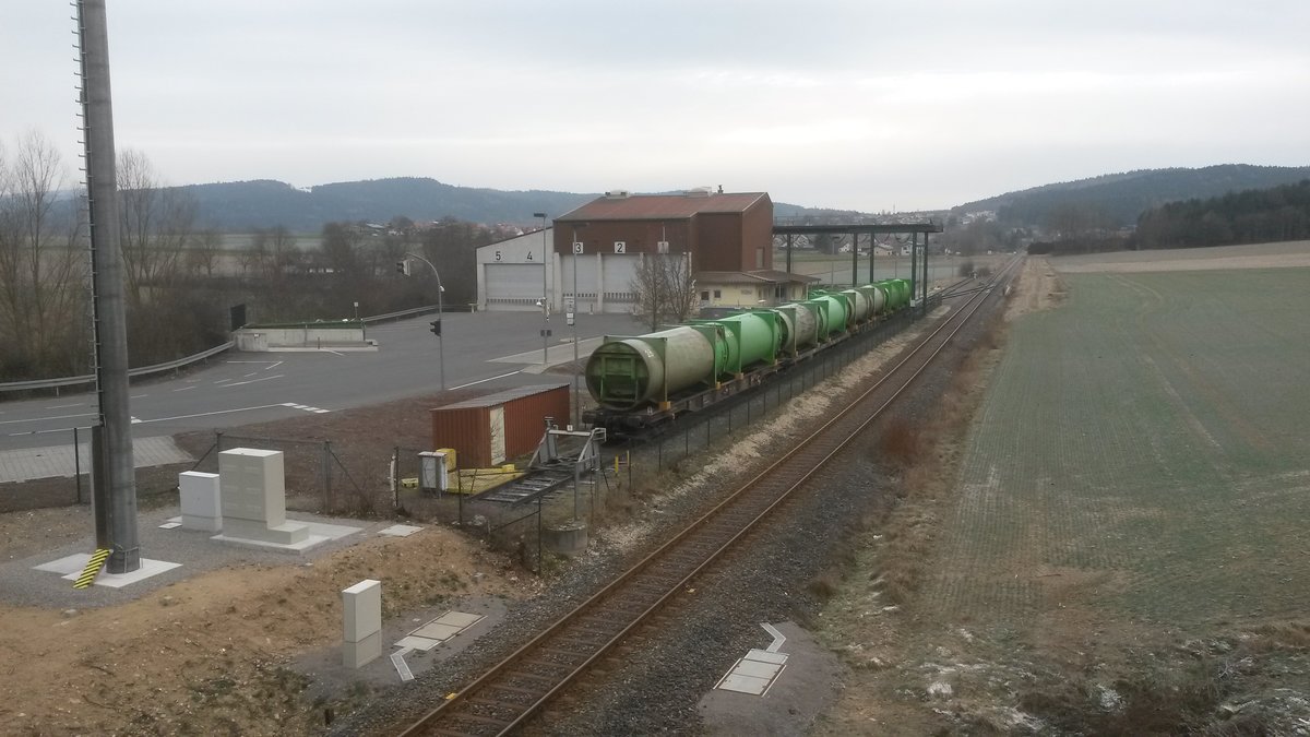 Nachher# Bahnsteig in Bürglen (TG) hat keine eingelassenen Schienen mehr - 2018 werden die mit Zuckerrüben befüllten Wagen vom verkürzten Verladegleis vor dem Bahnsteig auf das Streckengleis geschoben. Am 16.11.2018 hat Rem 487 001 der SRT die befüllten Wagen im "Last Mile"-Betrieb noch einige Meter auf dem Streckengleis zurückzuschieben, um dann das Dieselaggregat abzuschalten, den Stromabnehmer hochzufahren und auf Streckenfreigabe zur Zuckerfabrik nach Frauenfeld zu warten.