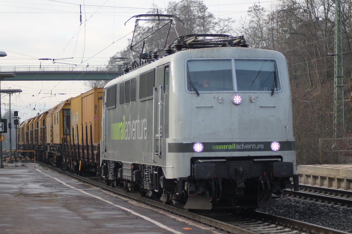 Manchmal lohnt es sich auch bei frostigen Temperaturen auszuharren.. Wie hier für 111 222, die am 28.12.2018 mit einem Bauzug durch Eichenberg in Richtung Norden rollte.