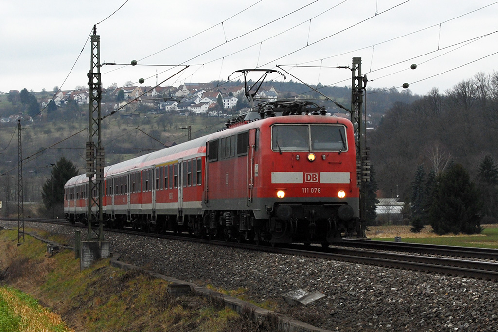 Nachschuss auf die 146 206, als sie am 20.12.2016 ihre RB (Neuenburg (Baden) - Offenburg) nördlich von Müllheim (Baden) gen Buggingen schob.
