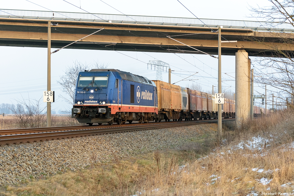 76 110-0 Raildox GmbH & Co. KG mit einem Hackschnitzelzug in Nennhausen und fuhr weiter in Richtung Rathenow. 09.02.2018