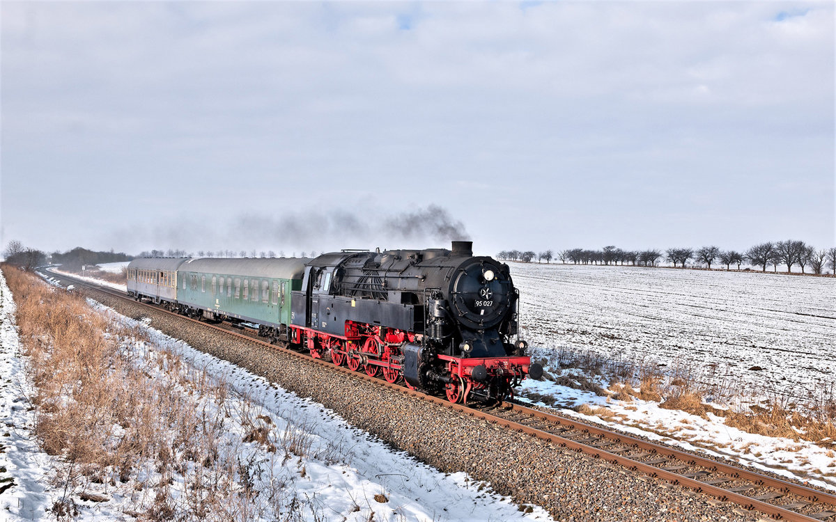 Die Bergkönigin 95 027 fährt mit dem Sonderzug 20103 aus Wernigerode kommend nach Thale Hbf in Schachdorf vorüber.Bild vom 10.2.2018
