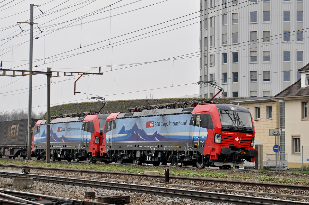 Doppeltraktion, mit den Loks 193 462-9 und 193 461-1, durchfahren den Bahnhof Pratteln. Die Aufnahme stammt vom 09.02.2018.