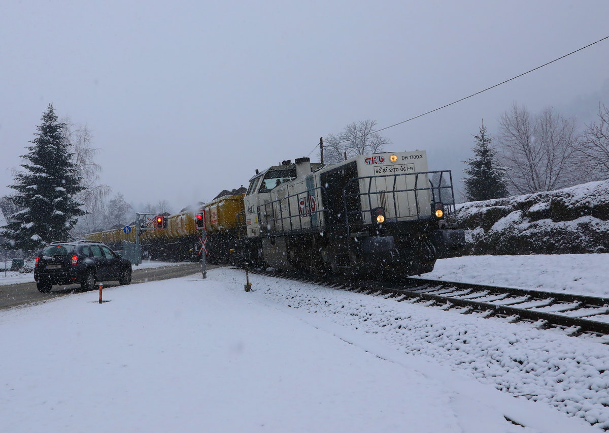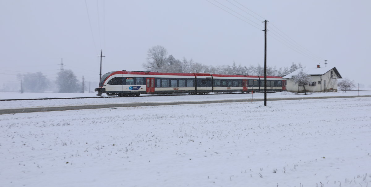 Durch dichten Schneefall der letzten Tage flitzen die Regionalzüge der Graz Köflacher Eisenbahn zuverlässig dahin. 7.2.2018 bei Bergla