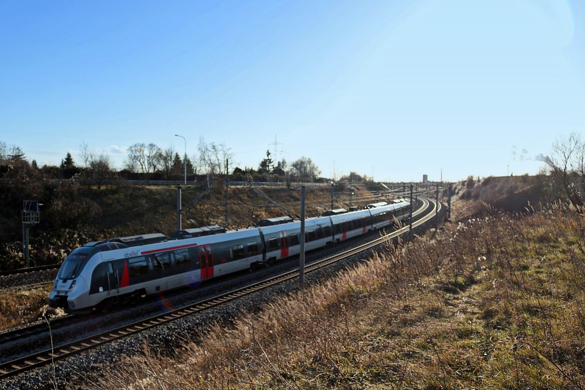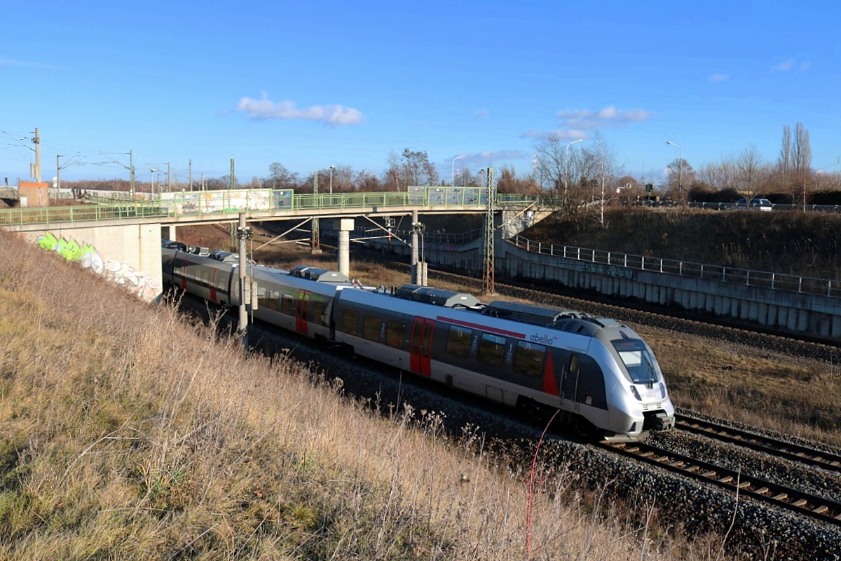 Eine BR 9442 (Bombardier Talent 2) von Abellio Rail Mitteldeutschland als RE 74586 (RE18) von Halle (Saale)Hbf nach Saalfeld (Saale) fährt in Halle (Saale), Kasseler Straße, auf der Bahnstrecke Halle–Bebra (KBS 580). [29.12.2017 | 13:14 Uhr]