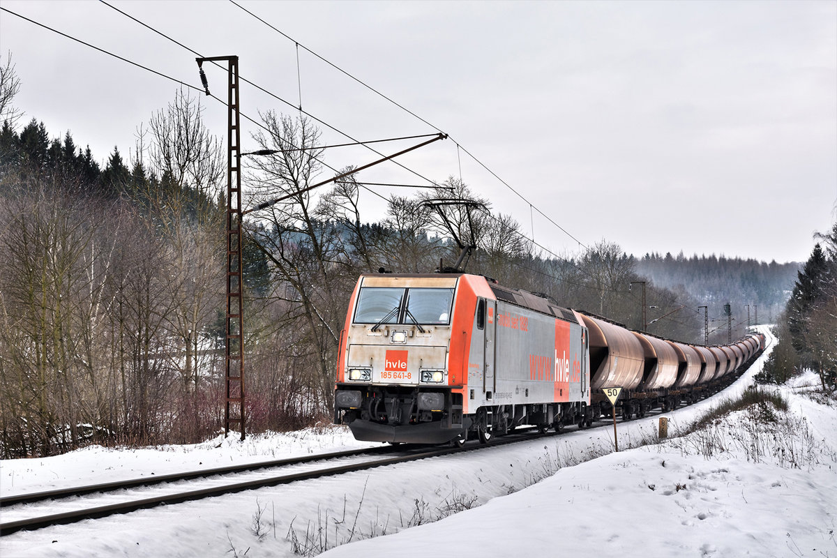 In Hüttenrode fährt die hvle 185 641-8 mit Unterstützung der schiebenden hvle 185 640-0 mit einem Kalkleerzug den Berg hinauf.Bild 10.2.2018