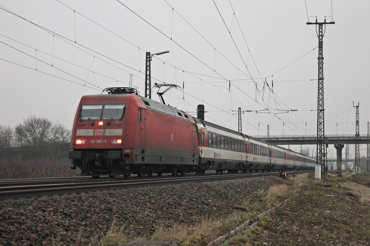 Mit dem EC 6 (Interlaken Ost - Hamburg Altona) fuhr am 20.12.2016 die 101 062-8 nördlich von Müllheim (Baden) auf der KBS 703 und fuhr in Richtung Freiburg (Breisgau), wo sie ihren nächsten Zwischenhalt einlegen wird.